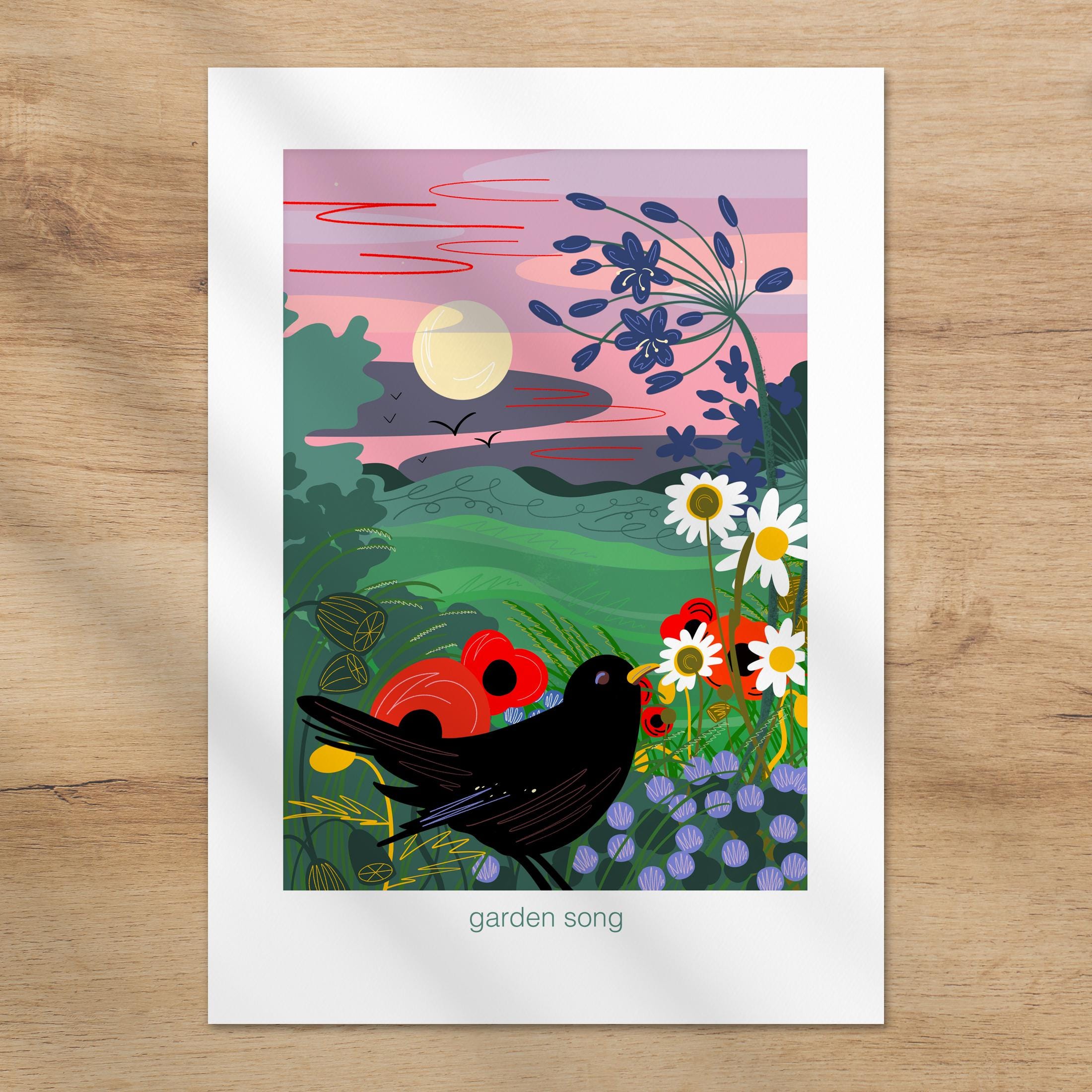 Garden Song is a peaceful, nature-inspired art print celebrating the quiet beauty of an evening garden. The illustration features a blackbird nestled among agapanthus, daisies, poppies and clover, capturing a moment of stillness, birdsong and fading light.