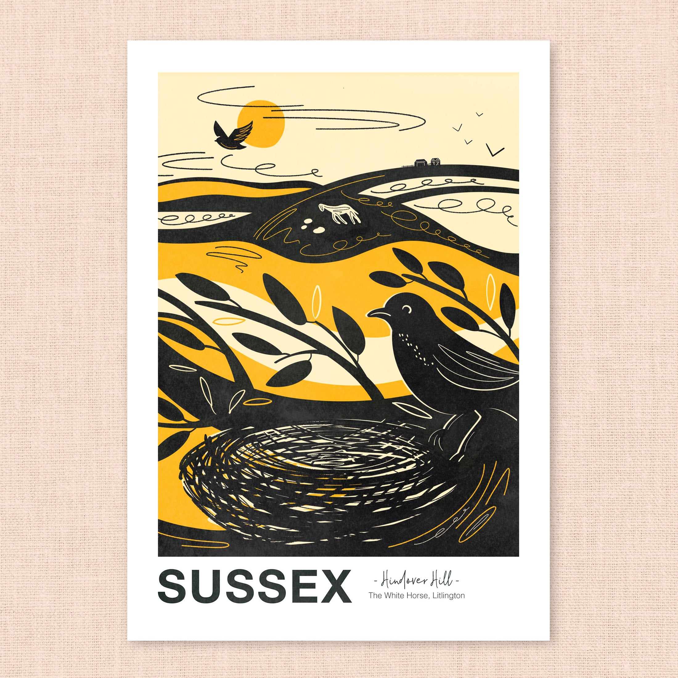 The Hindover Hill print features a minimalist illustration from the Sussex collection, a series celebrating the distinctive landscapes and coastal scenery of Sussex. Each design is created using a restrained colour palette of black, warm cream and a single accent colour, giving the collection its recognisable, graphic character.