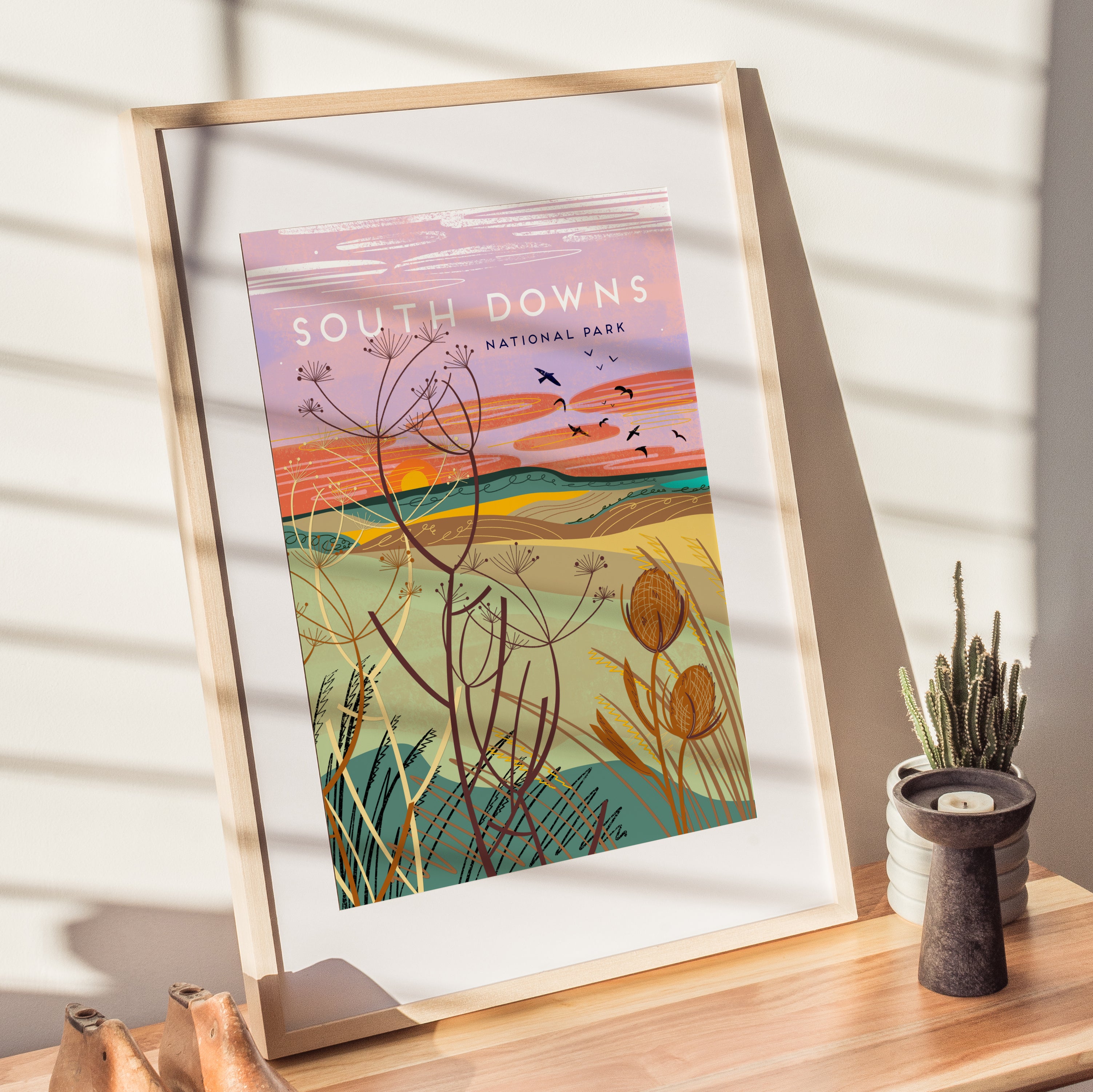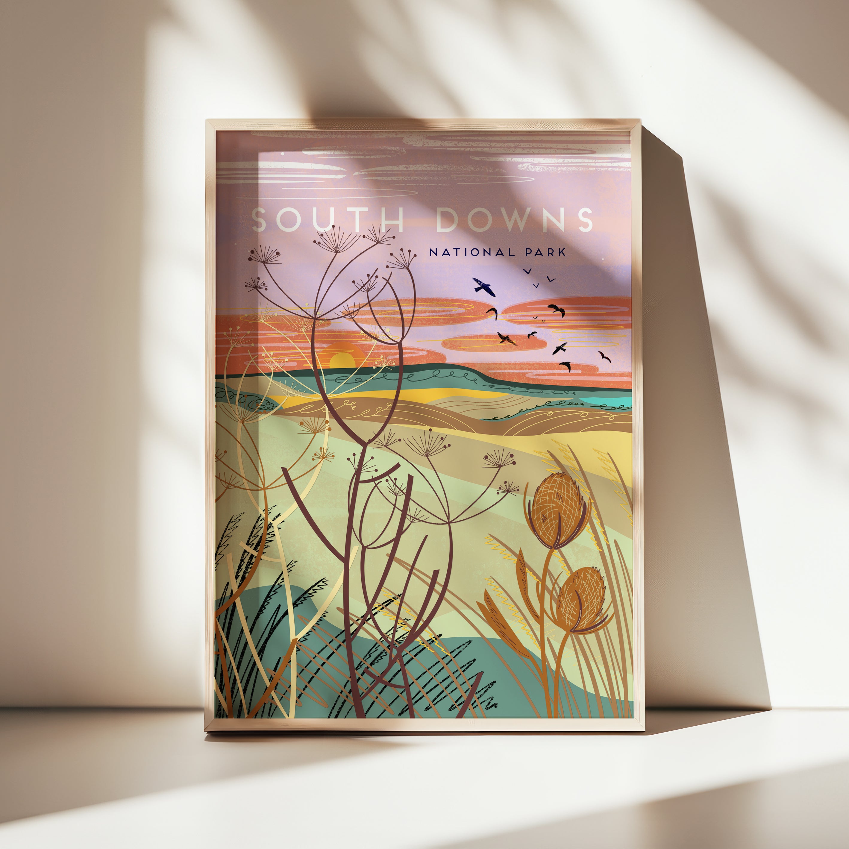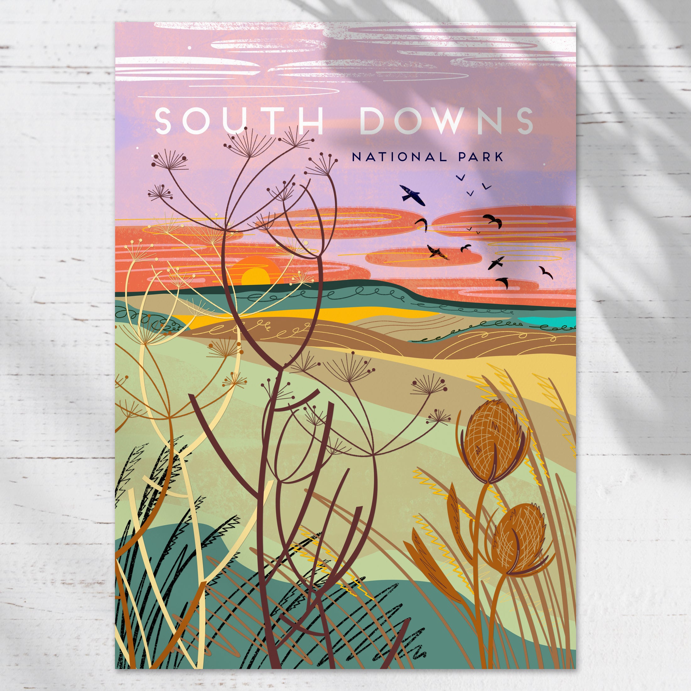The scene captures the gentle rhythm of the rolling hills, with seed pods and long grasses framing the field as the setting sun colours the sky. The illustration evokes the quiet stillness, light and expansive beauty of the South Downs.