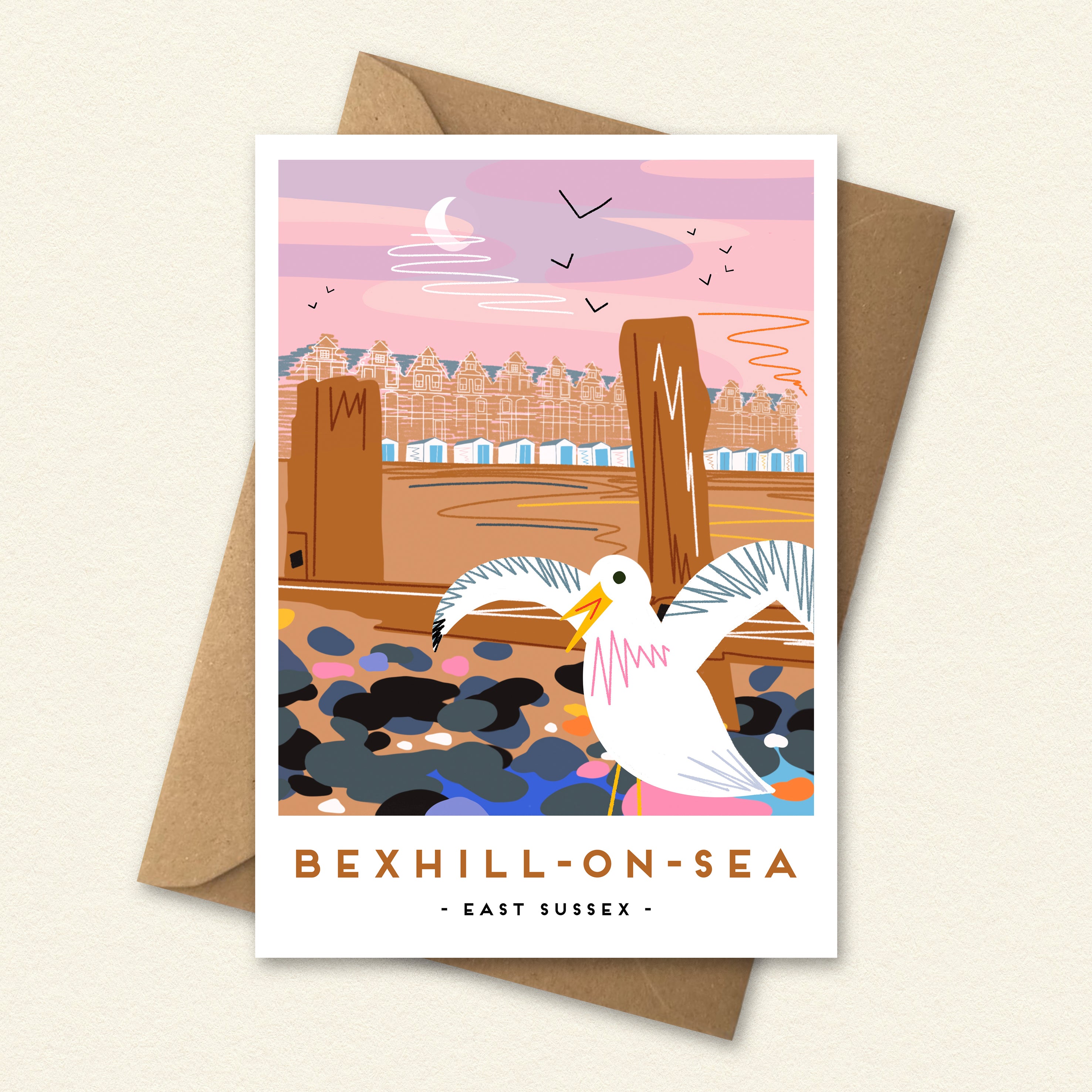 This greeting card shows the beach huts on Bexhill beach with the Dutch inspired gable houses behind and a seagull in the foreground.