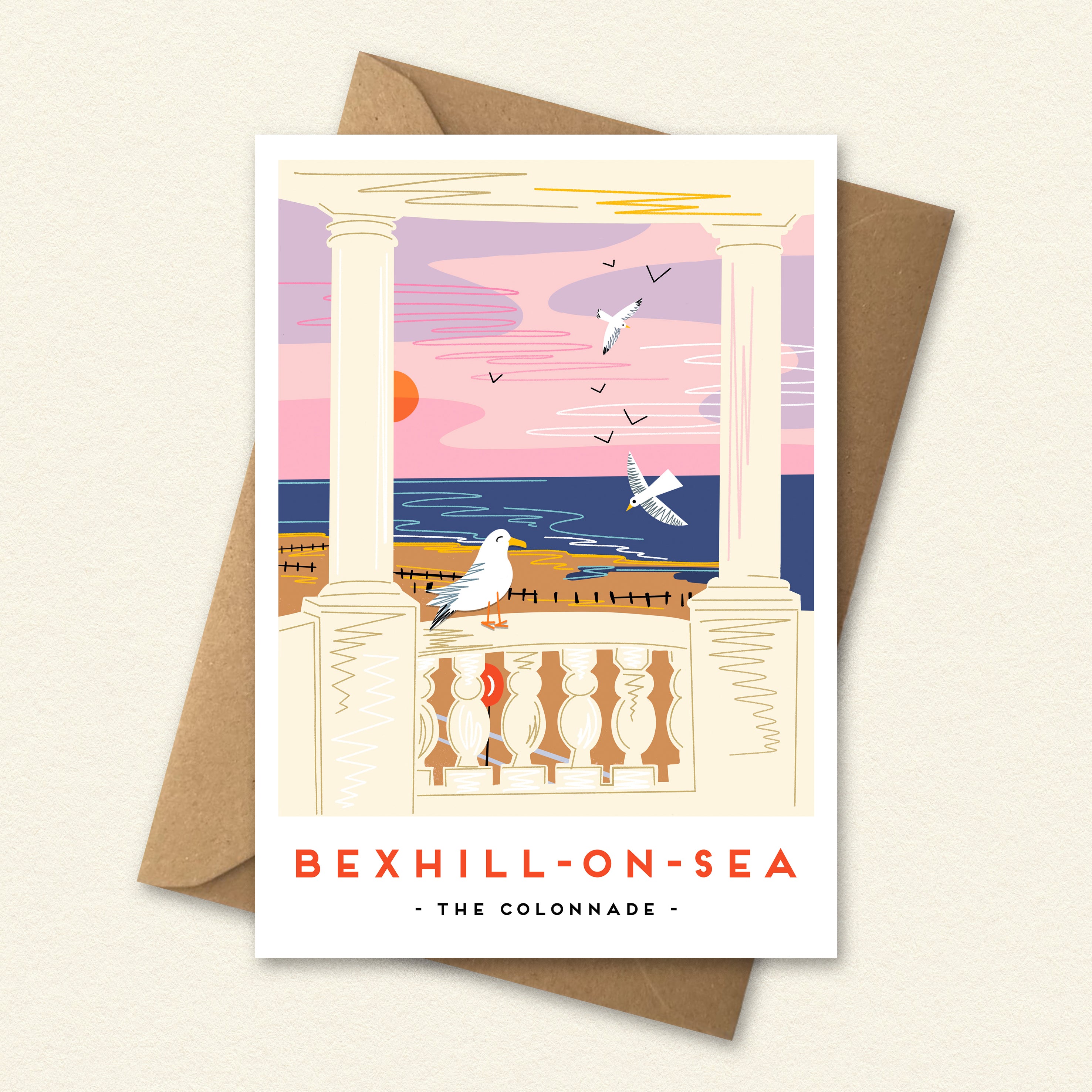 This greeting card shows a detail of the Colonnade a Grade II listed building on Bexhill's sea front, built to commemorate the coronation of King George V.