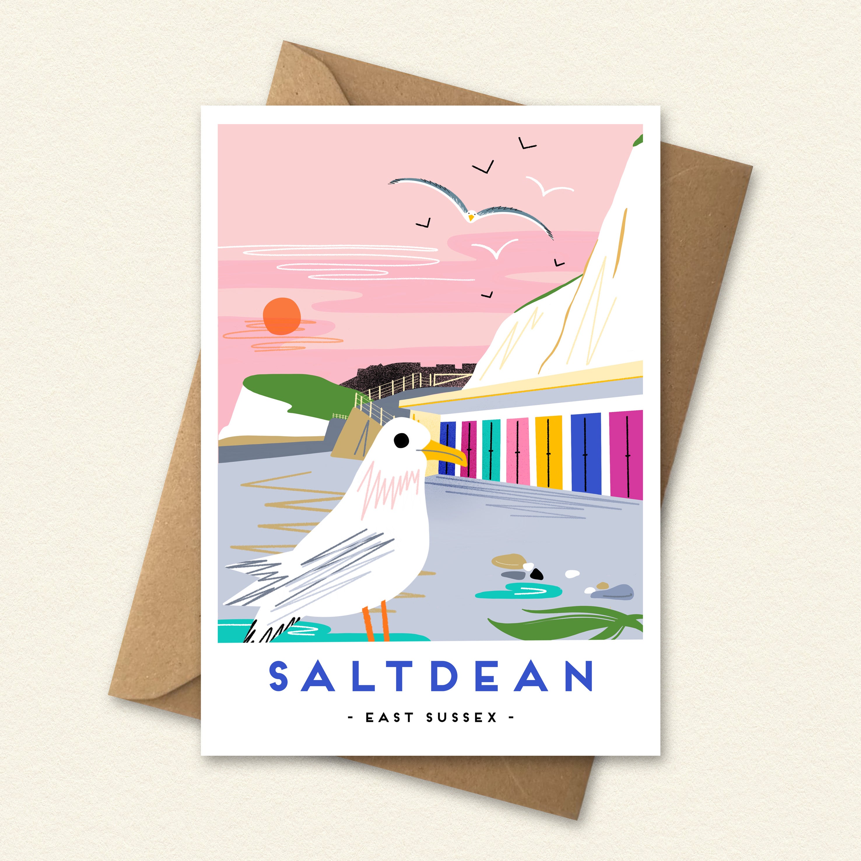 The Saltdean greeting card features an illustration from the Landmark collection, a series inspired by well-loved local places and the character of familiar landscapes. First developed during a period of quiet reflection, these designs have become favourites within the local community.