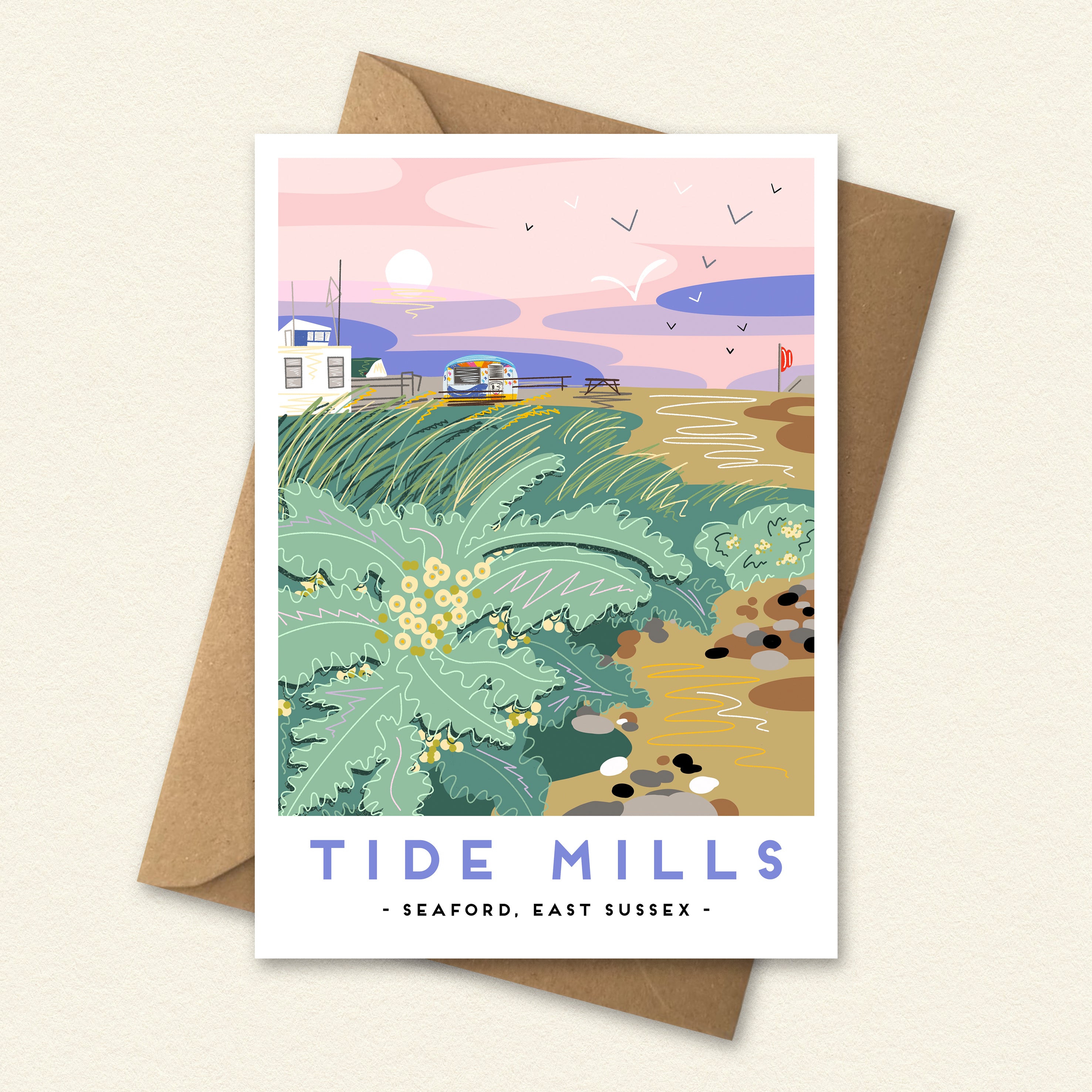 This greeting card shows the little coffee caravan the Tide at Tide Mills nature reserve at the end of Seaford Beach.