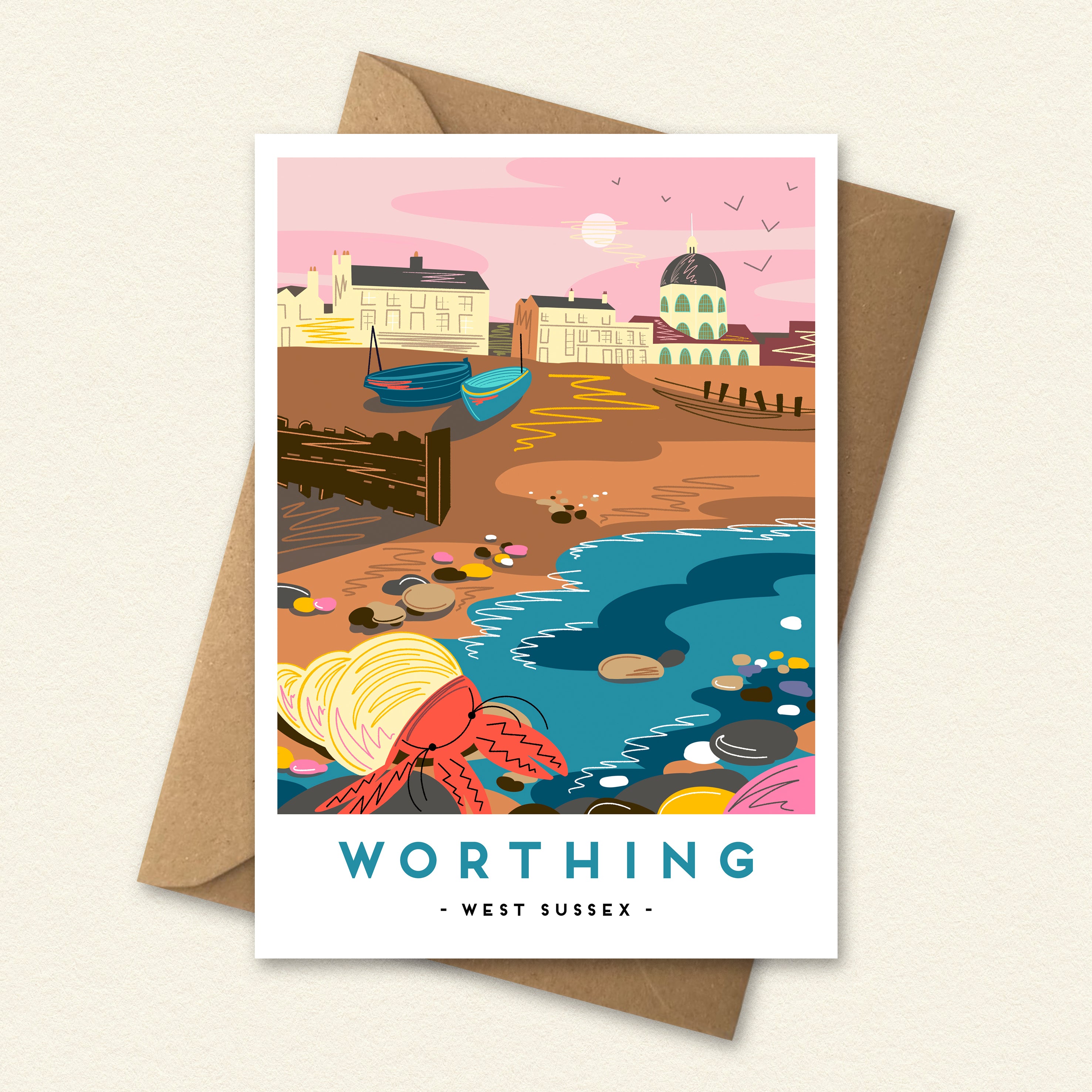 The Worthing greeting card features an illustration from the Landmark collection, a series inspired by well-loved local places and the character of familiar landscapes. First developed during a period of quiet reflection, these designs have become favourites within the local community.